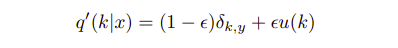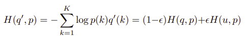 위 식과 같이 준다. 여기서 delta 함수는 ground truth label을 말하는 거 같고, epilon 값을 주어 약간 낮추고, 다른 label값에는 추가적으로 label값을 나누어 주는 것이다. 결국 이를 고려한 loss function은 다음과 같다.
