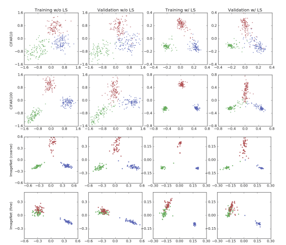 우선 결과를 비교해보자면, label smoothing을 한 것이 더 clustering을 촘촘하게 한 것을 확인할 수 있다(그러나 accuracy는 차이가 없다고 한다). 이것에 대해서는 다음과 같이 설명하는데,