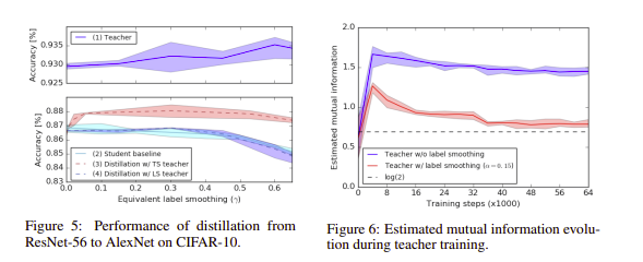 왼쪽 아래 figure 에서 보라색 점선이 label smoothing을 받은 student network인데, 성능이 base보다 약간 떨어지는 것을 확인할 수 있다. 이에 대한 이유로는 정보를 erase 한다고 하는데 Mutual information방법을 사용해 오른쪽 figure값을 그려서 설명한다. 보라색 선은 hard target값과 teach network의 logit값 사이에 상호정보량을 나타내고 아래 주황색 선은 soft target과 teacher network의 logit값 사이에 상호 정보량을 나타내는데 더 낮음을 볼 수 있는데 이는 정확히 이해를 하지 못했고 그런갑다 하고 넘어가려고 한다.