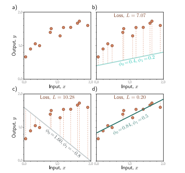 지도학습에서는 x -> y로 가 되는 mapping을 모델이 찾도록 목표로 한다.이를 표기로 하면은 y = f(x)이고 f는 x를 input으로 받고 y를 output으로 뱉는 모델이다. 이렇게 우리가 input으로부터 y를 예측하는 것을 inference라고 한다. 모델은 parameters 를 가지는데 어떠한 파라미터 집합을 가지느냐에 따라 input - output에 대한 관계가 달라질 수 있다. 한번 이를 나타내보면 $y = f[x , \phi ]$ 라고 할 수 있다. 따라서 우리가 모델을 학습시키고 훈련시키는 것은 파라미터 $\phi $를 찾는 것이라고 볼 수 있다. 우리는 이러한 mapping과정에서 손실 값을 수량화할 수 있는데 이를 파라미터에 대한 손실값이라고 한다. 이를 나타내면 $ L[\phi] $ 로 나타내며 scalaer값이다. 그렇다면 우리는 $ \phi^{hat} = argmin_{\phi}[L[\phi] $ 이렇게 나타낼 수 있는데 손실함수에서 나온 손실 값을 최소화 시키는 $ \phi^{hat} $ 값을 찾는 것이다. 훈련이 다 끝난다면 테스트 데이터(훈련과정에서 보지 않은)로 하여금 모델이 얼마나 일반화를 잘하는지 볼 수있다.